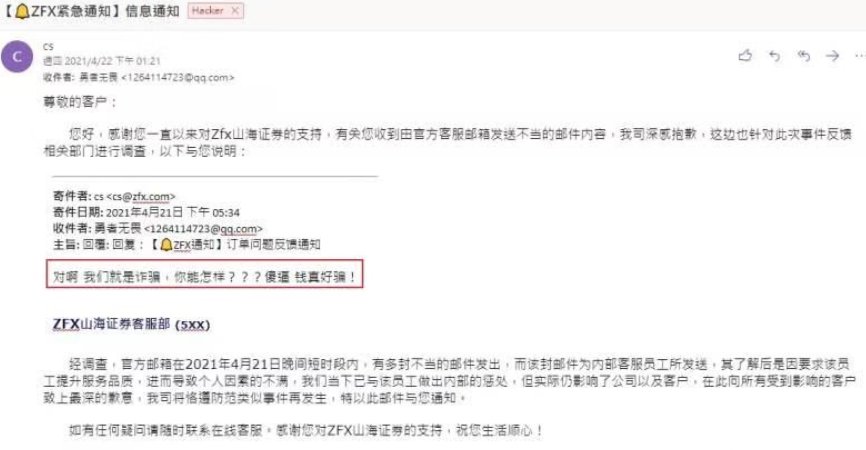 4月21日傍晚5点45分左右,我收到zfx大量不当邮件!从来没有看到那么没礼貌的客服!一定要曝光这种垃圾客服!花钱买难受