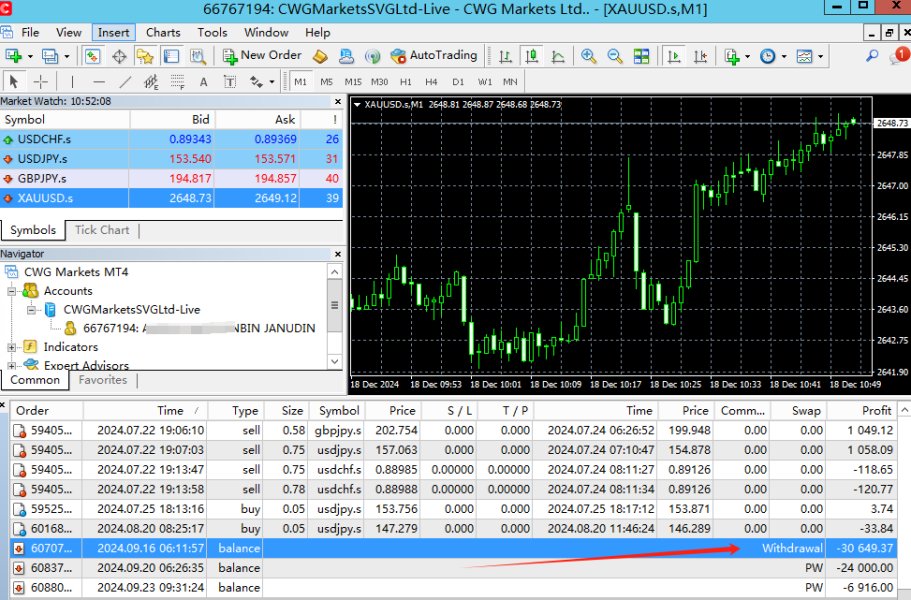 CWG MARKETS彻头彻尾的诈骗平台!无耻至极,大家千万不要上当受骗! 我和朋友都有相同的悲惨遭遇,我要彻底揭露CWG MARKETS这家诈骗券商的恶劣行径,提醒所有人远离这个陷阱! 事情发生在今年2024年6月,我的账户突然被封,没有任何解释、没有预警,完全被平台单方面关闭。我多次联系客户经理和客服,但他们的回应要么是推诿敷衍,要么就是恶意拖延,完全不给任何合理说法。这种态度简直就是在戏弄受害者,让人愤怒又无助! 更令人无法接受的是,经过几个月的等待,情况非但没有好转,反而变本加厉!到了2024年9月,CWG MARKETS竟然无故扣除了我账户高达30649,这完全就是赤裸裸的诈骗行为!扣了我的钱后,他们甚至厚颜无耻地要求我提取剩余资金并离开平台!这是什么逻辑?这是彻底把客户当作肥羊宰割,毫无道德底线! 希望所有人引以为戒,千万不要再被骗! 如果你也遇到了类似的情况,请勇敢站出来曝光他们,我们绝不能让这样的诈骗平台继续肆意妄为,坑害更多人!