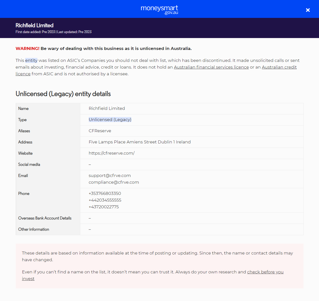 النوع: غير مرخص (قديم) كيان غير مرخص. هذا الإدخال منقول من قائمة "الشركات التي لا يجب التعامل معها"، والتي تم إيقافها في عام 2023.