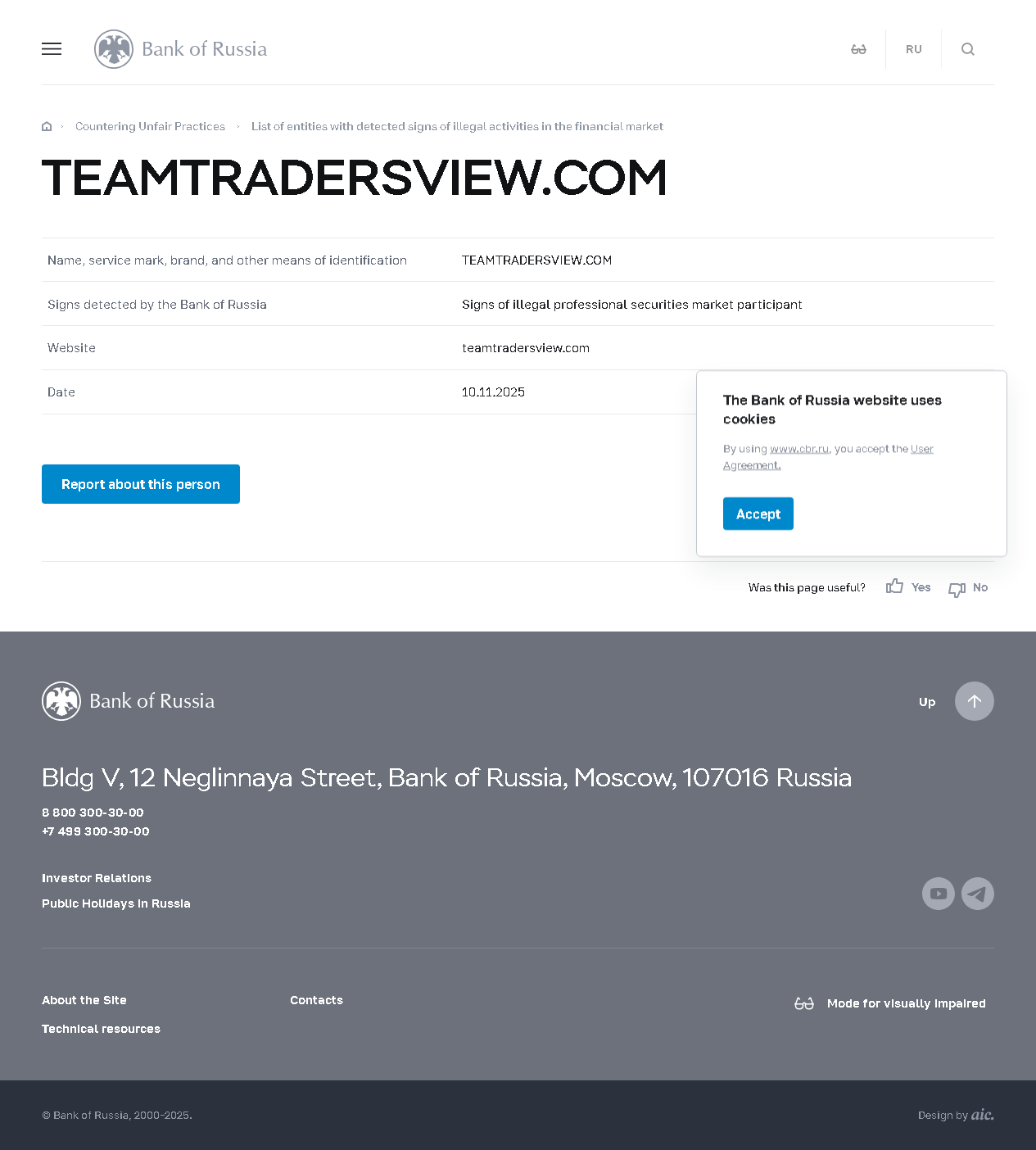 قائمة الكيانات التي تم اكتشاف علامات على أنشطة غير قانونية في السوق المالي TEAMTRADERSVIEW.COM.
