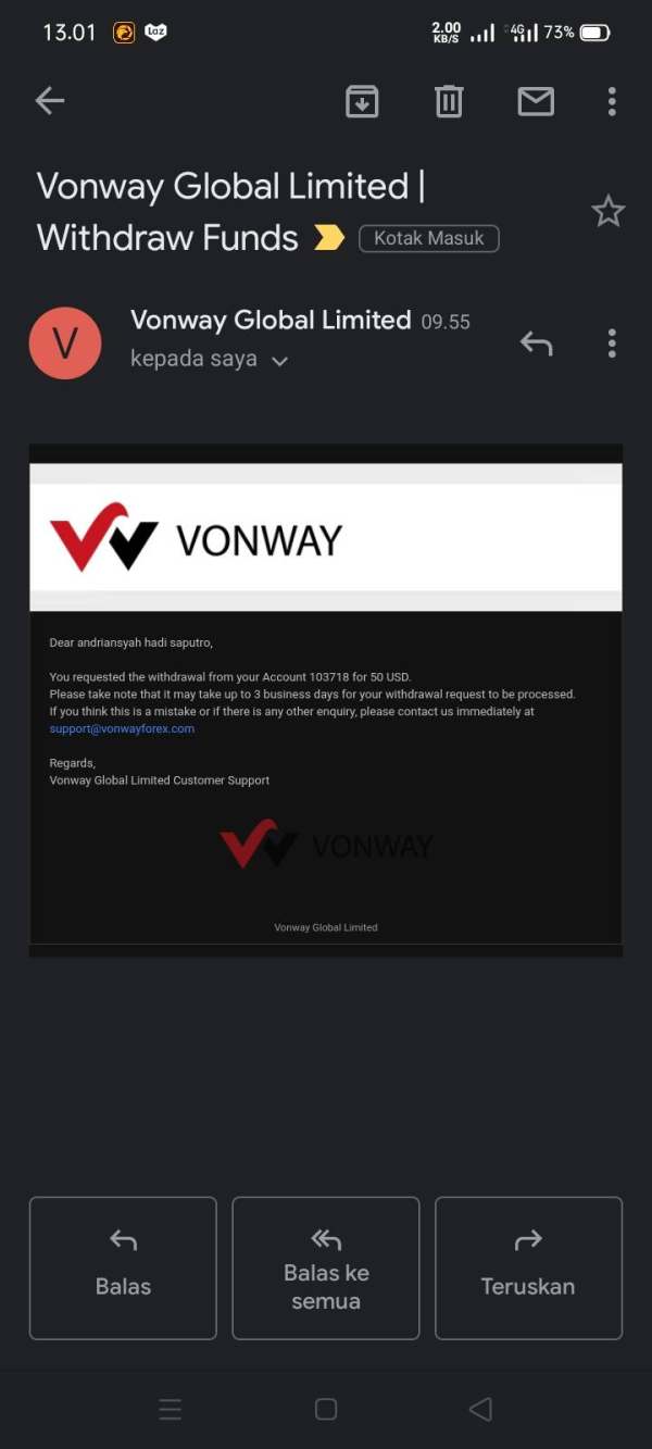 apakah ini macam penipuan,,saya mencoba pencairan dana 50 usd ke rekening saya ,tetapi membutuhkan waktu yang cukup lama.sedangkan layanan pelangan tidak berfungsi,mengirim pesan ke email ke suport vonway tidak ada balasan sama sekali