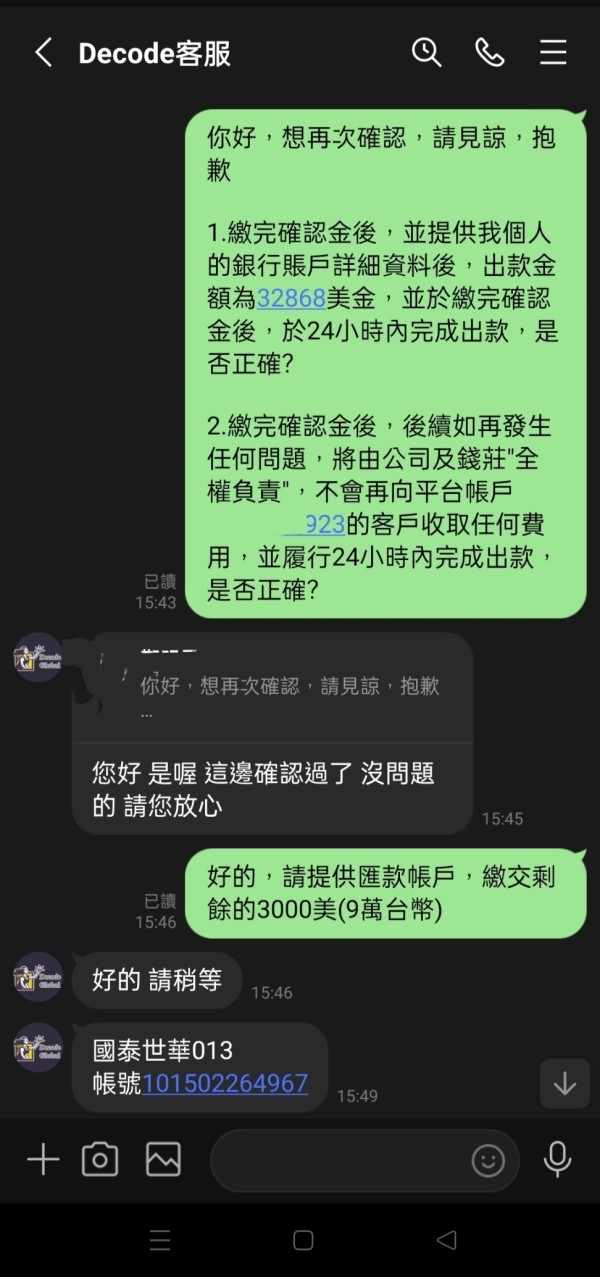 申請3萬2千美金出金,且再三確認不會再有任何異常,但最後又要解繳25萬台幣的擔保金,該客服自稱是Decode Global的台港服務平臺,來求證並退出。 網址:http://www.decodesftw.com/index/login/login/token/4dc0ead78f2f1ff607b97f87dec861ef.html