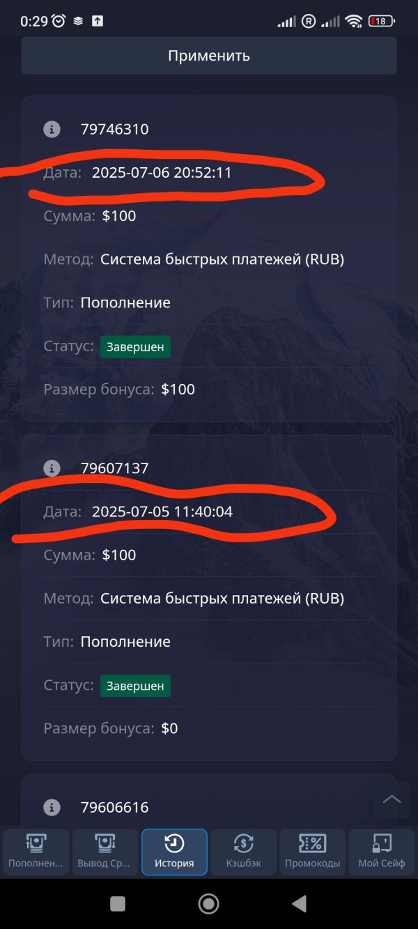 Описание случившегося: 1) 05.07.2025 — перевод на $50: банковский чек (Сбер) показывает время 11:41:14 (МСК), платформа — 11:40:04. Разница: 1 мин 10 сек, при том что в платформе время раньше, чем в банке. 2) 06.07.2025 — перевод на $50: банк 20:56:25, платформа 20:52:11 — разница 4 мин 14 сек, платформа опять отображает более раннее время. 3) После моих обращений платформа несколько раз задним числом меняла баланс и временные метки. При этом поддержка ссылалась на «часовой пояс UTC+2», но минутные расхождения и факт отображения времени ДО банковской отметки это не объясняют. 4) Я требовала полные сырые логи (timestamps в UTC, информация о модификациях записей), а также отчёт по 05.07 (сколько сделок, прибыль/убыток и т.д.) — мне прислали неполные отчёты и уклончивые ответы.