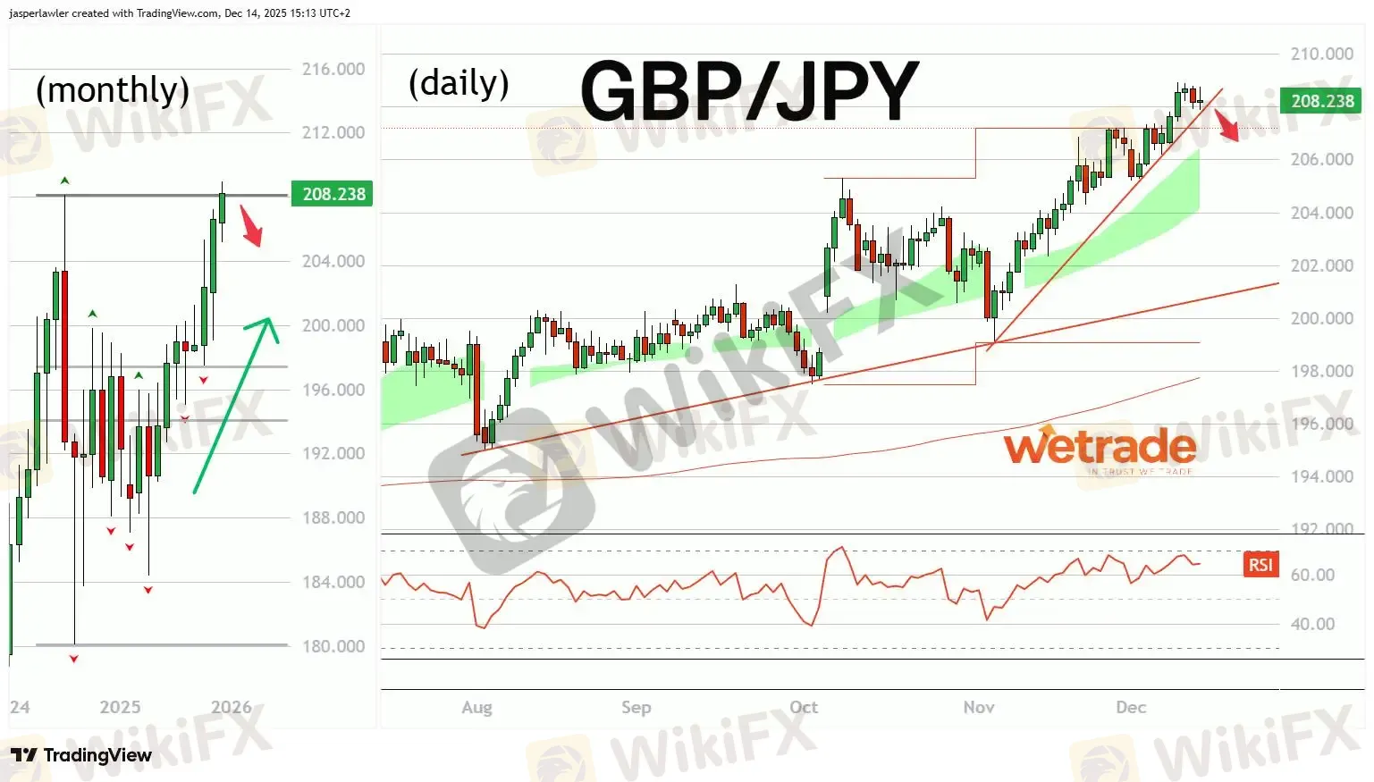 - The monthly chart is testing key resistance at 208.0.