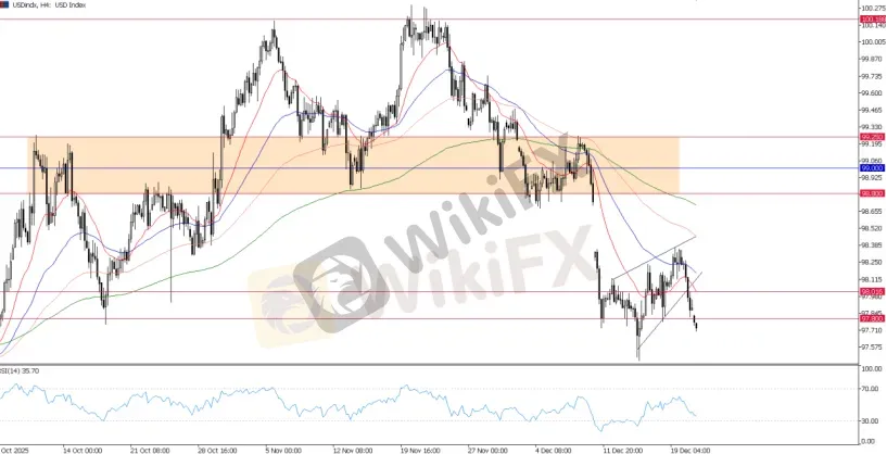 The US Dollar Index is struggling to hold the 98.00 level. With the recent rising wedge pattern broken, the technical outlook signals a continuation of broader bearish momentum.
