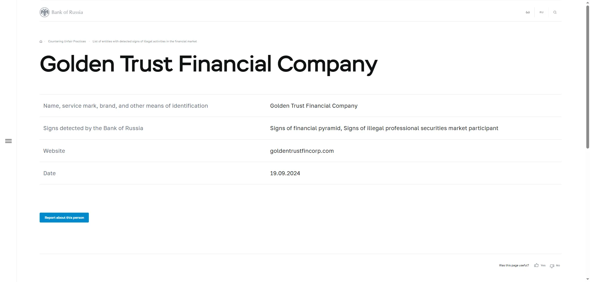Liste der Unternehmen mit festgestellten Anzeichen illegaler Aktivitäten auf dem Finanzmarkt Golden Trust Financial Company.
