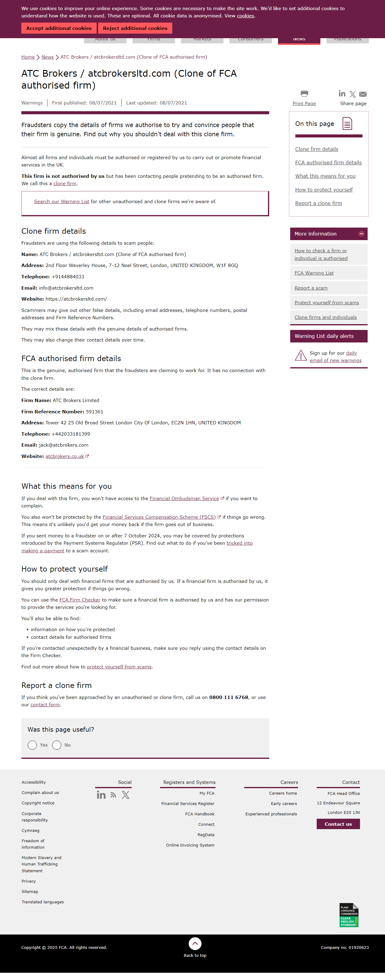FCA-Warnliste nicht autorisierter Unternehmen ATC Brokers / atcbrokersltd.com (Kopie eines FCA-autorisierten Unternehmens).