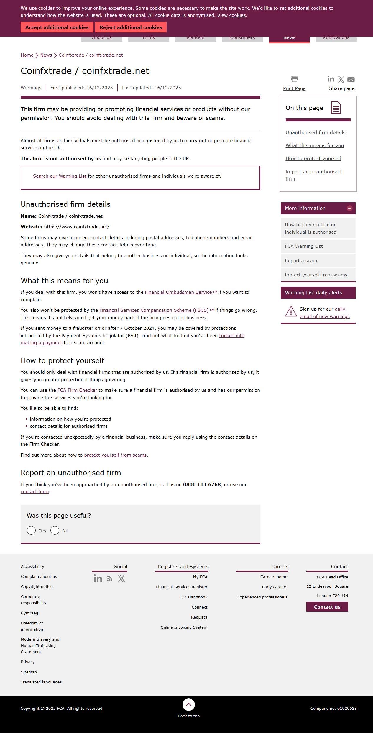 FCA-Warnliste nicht autorisierter Unternehmen Coinfxtrade / coinfxtrade.net.