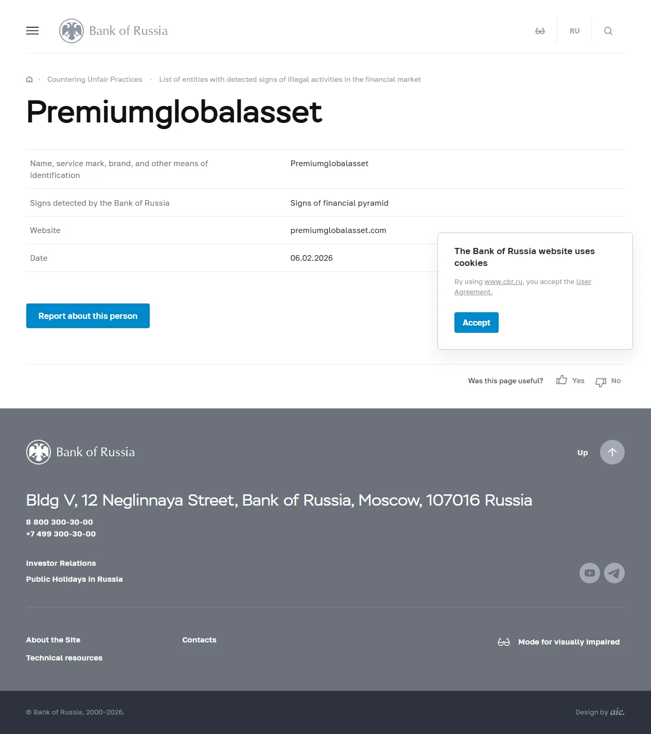 Liste von Entitäten mit festgestellten Anzeichen illegaler Aktivitäten auf dem Finanzmarkt Premiumglobalasset.