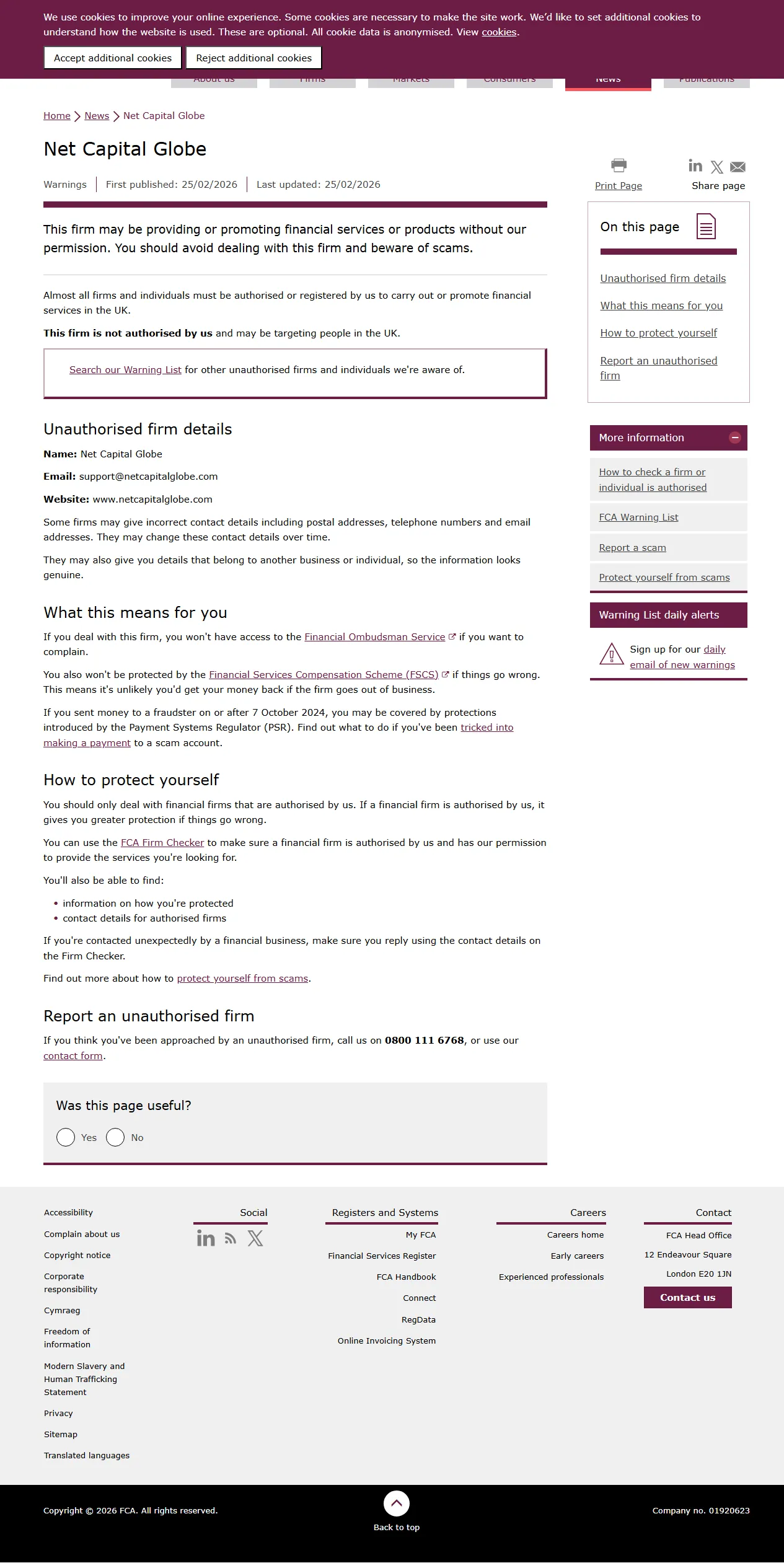 FCA-Warnliste nicht autorisierter Unternehmen Net Capital Globe.