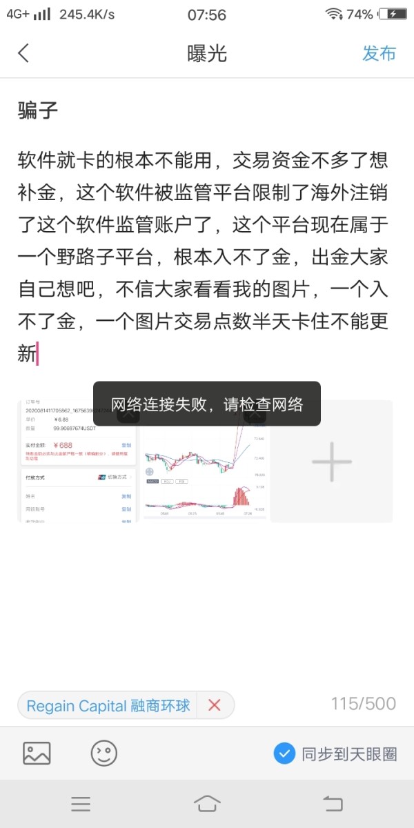 软件就卡的根本不能用,交易资金不多了想补金,这个软件被监管平台限制了海外注销了这个软件监管账户了,这个平台现在属于一个野路子平台,根本入不了金,出金大家自己想吧,不信大家看看我的图片,一个入不了金,一个图片交易点数半天卡住不能更新,