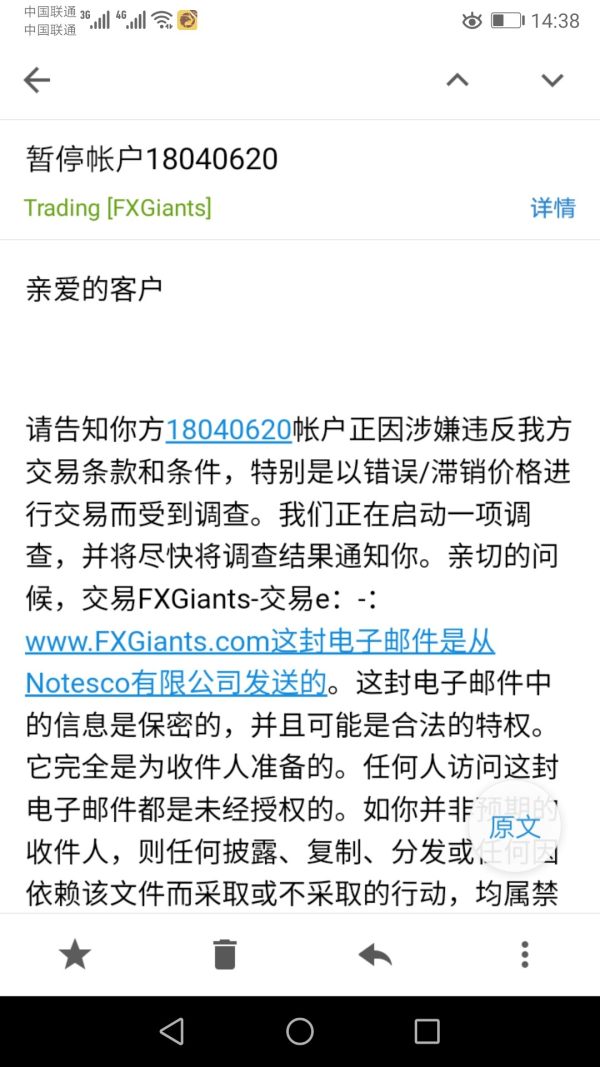 FXGiants出金事宜沟通无果,账号直接被暂停,并且无法登入显示拒绝登入。作为交易者深深感受到此平台恶劣的做法,怀疑FXGiants欺诈交易者财产。并且无法保证交易者资金安全。恶意封掉账号,工作人员对此解释含糊其辞。平台至今还未出金。敛财跑路的节奏。