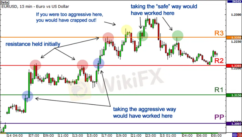Otherwise, if you had taken the safe way and waited for a retest, you would have been one sad little trader. The price did not retest after breaking R1. In short, the same thing happened for both R1 and R2. Also Notice how EUR/USD bulls tried to make a run for R3 as well.
