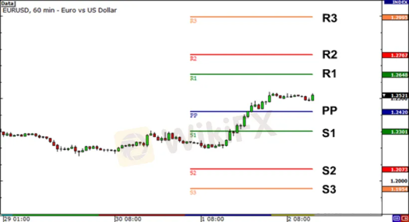 Below is an example of pivot points plotted on a 1-hour EUR/USD chart: