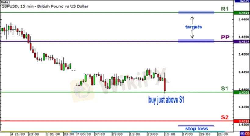 looking at the above chart you see that price is testing the S1 support level. If you think it will hold, what you can do is buy at the market and then put a stop loss order past the next support level. If you‘re stable, you can set a large stop just below S2. If the price reaches past S2, chances are it won’t be coming back up, as both S1 and S2 could become resistance levels.