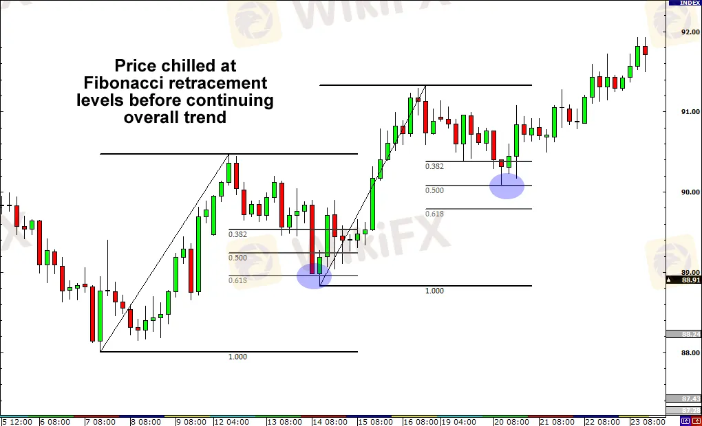 Price retracements tend to loiter around the Fibonacci retracement levels of 38.2 percent, 50.0 percent, and 61.8 percent before continuing the overall trend.