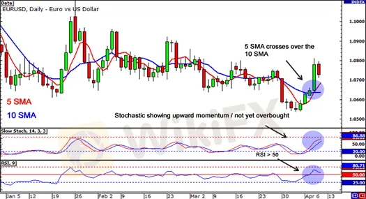 The Stochastic can assist us assess if we can still enter a trade following a moving average crossing, as well as avoid oversold and overbought zones.