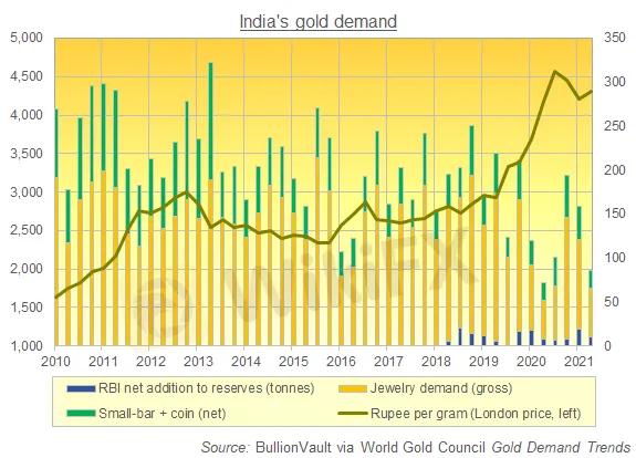 As for jewelry buying, and “given that India's rural economy was adversely impacted during the [spring's] severe second wave of the pandemic,” says specialist consultancy Metals Focus, “a revival could boost gold demand during the all-important wedding and festive season” starting in October and running into New Year 2022.