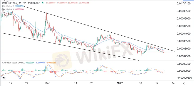 The four-hour chart shows that the SHIB/USD pair has been in a strong bearish trend in the past few months. It has formed a descending channel pattern. On the daily chart, this channel has a close resemblance to a falling wedge pattern. The SHIB price is along the upper side of this pattern. It is also along the 25-day moving average.