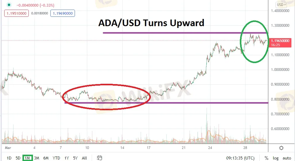 The ability of ADA/USD to incrementally rise in the last two weeks of March is intriguing. When ADA/USD was able to puncture the 1.00000000 mark on the 22nd of March it did see more bullish momentum gather as buying was triggered. A positive technical indication in the near term has been the ability of Cardano to sustain this upward move, and not suffer a sudden wave of violent profit taking. This may indicate traders of ADA/USD believe additional upside could transpire.