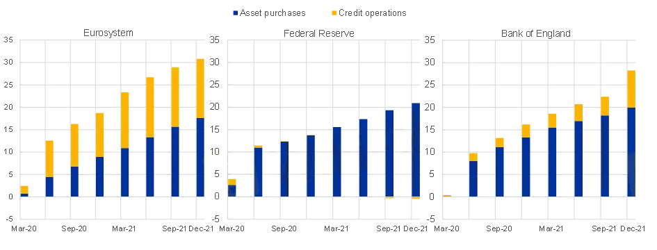 Notes: For the Eurosystem asset purchases include all PEPP and APP purchases. Credit operations include all TLTROs, PELTROs, MROs, and LTROs. For the Federal Reserve asset purchases include all Treasury bills, notes, and bonds as well as inflation-protected Treasuries and floating-rate Treasuries. These also include agency bonds and mortgage-backed securities. Credit operations include all repurchase agreements, loans, and operations under the Commercial Paper Funding Facility II, the Corporate Credit Facility, the Municipal Liquidity Facility, the Main Street Lending Programme, and TALF II. For the Bank of England asset purchases include all Gilts and corporate assets held within the Asset Purchase Facility. Credit operations include all operations within the ILTR, CTRF, TFS and TFSME. The latest observations are for December 2021.