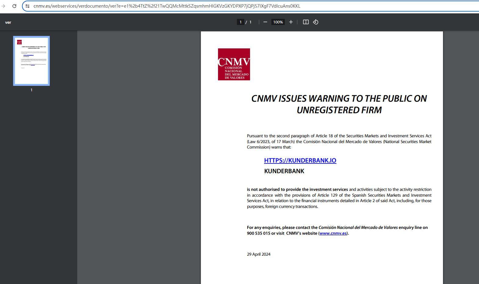 - Reason for punishment HTTPS://KUNDERBANK.IO KUNDERBANK is not authorised to provide the investment services and activities subject to the activity restriction in accordance with the provisions of Article 129 of the Spanish Securities Markets and Investment Services Act.
