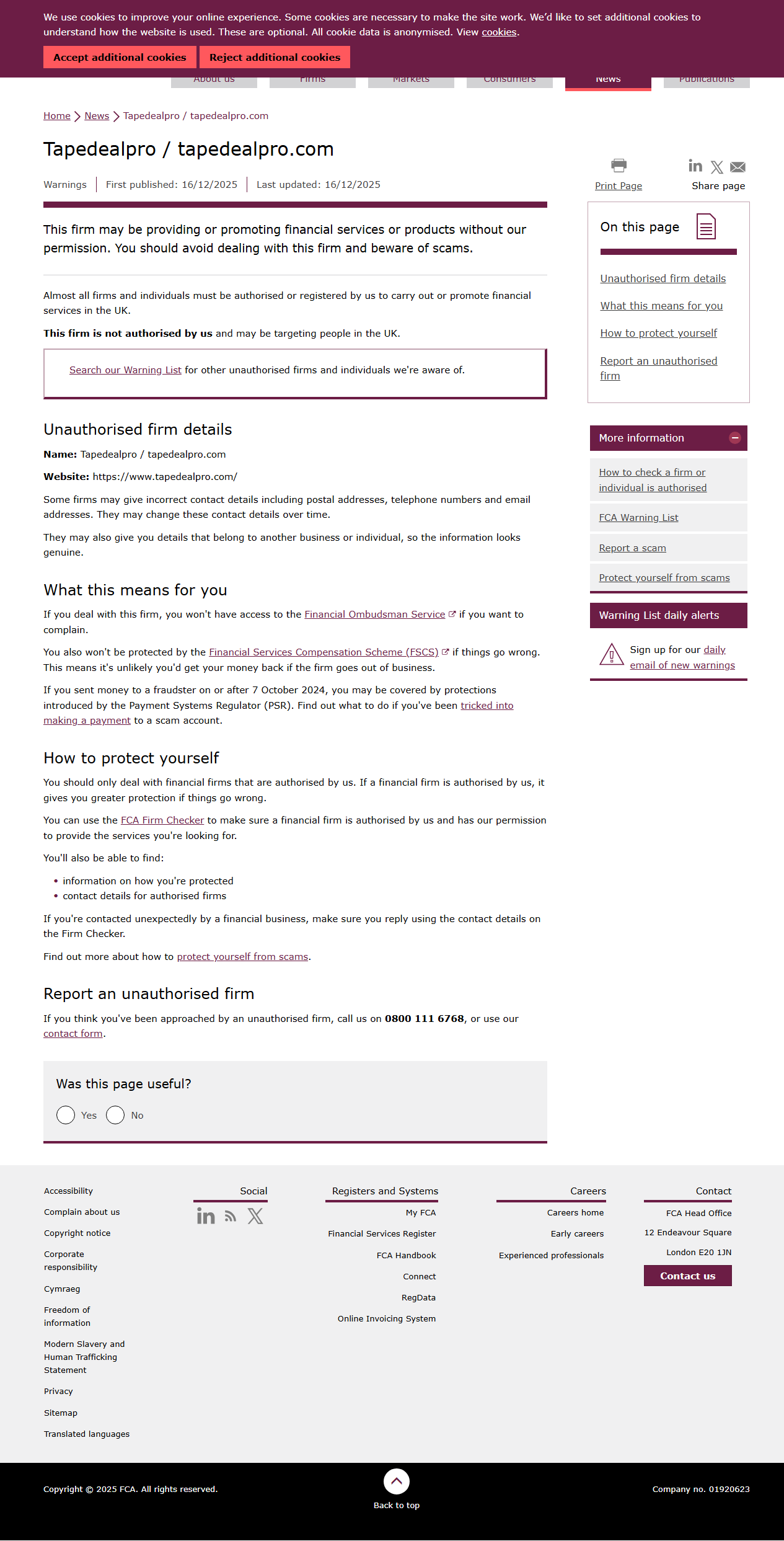 FCA Warning List of unauthorised firms Tapedealpro / tapedealpro.com