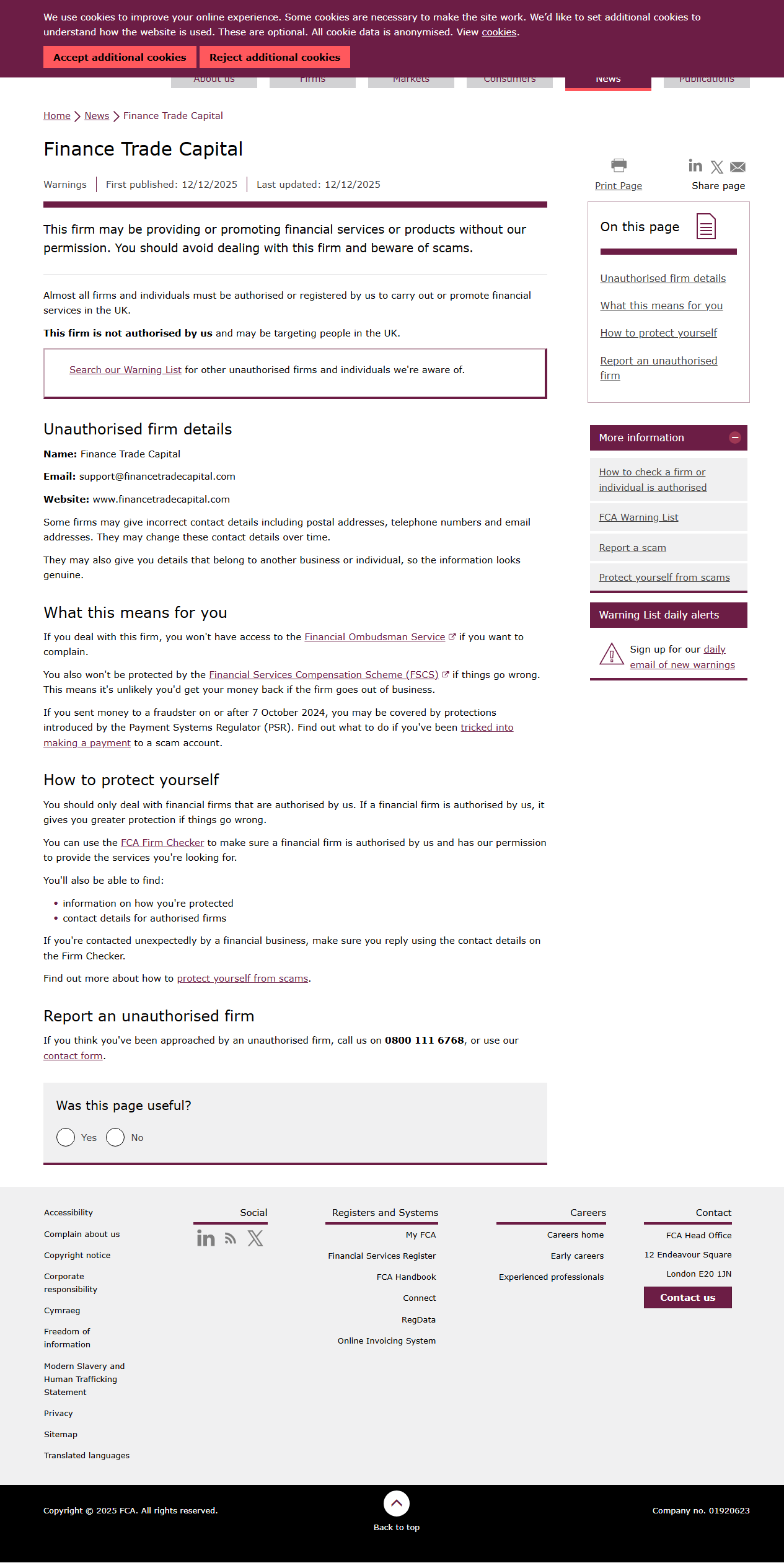 ['This firm may be providing or promoting financial services or products without our permission. You should avoid dealing with this firm and beware of scams. Almost all firms and individuals must be authorised or registered by us to carry out or promote financial services in the UK. This firm is not authorised by us and may be targeting people in the UK. Search our Warning List for other unauthorised firms and individuals we're aware of. Unauthorised firm details Name: Finance Trade Capital Email: support@financetradecapital.com Website: www.financetradecapital.com Some firms may give incorrect contact details including postal addresses, telephone numbers and email addresses. They may change these contact details over time. They may also give you details that belong to another business or individual, so the information looks genuine. "]