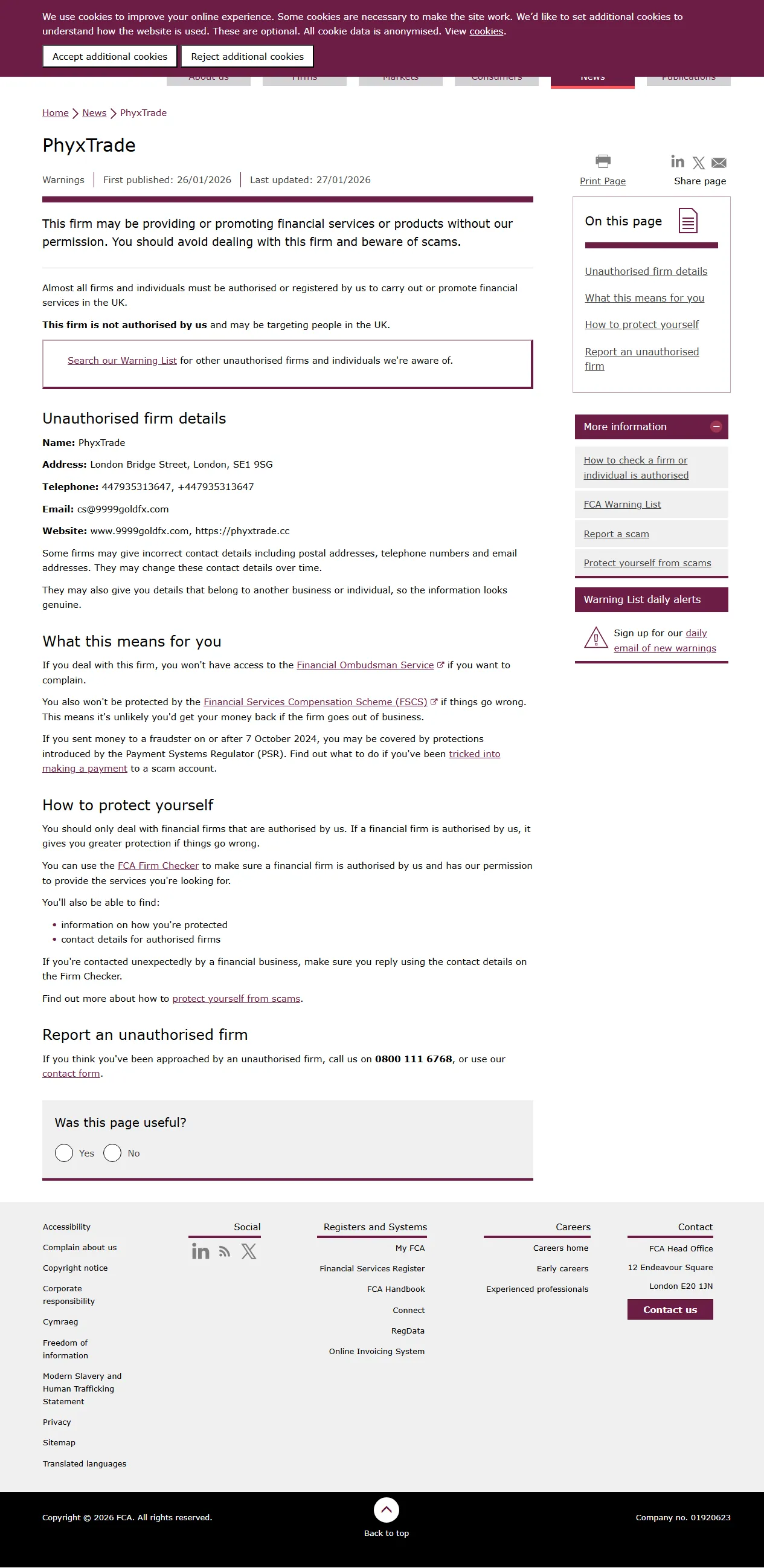 FCA Warning List of unauthorised firms PhyxTrade