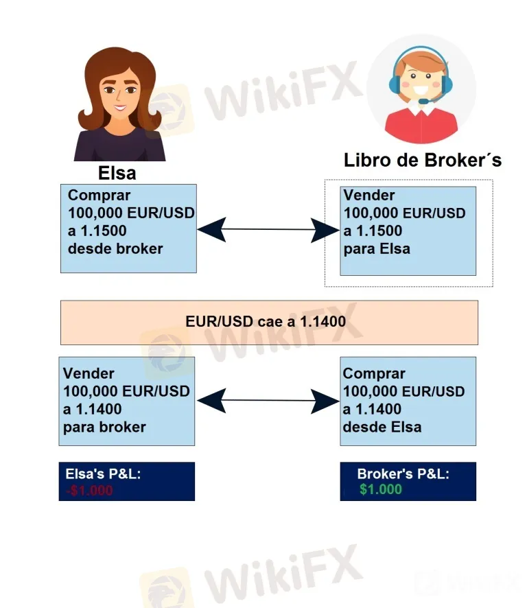 En el ejemplo anterior, Elsa recorrió largo 100,000 EUR / USD a 1.1500. Su bróker “B-Booked” (tomó lo contrario de) la operación y está corto 100,000 EUR / USD.
