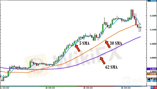 Observe cómo el 62 SMA está más lejos del precio actual que los 30 y 5 SMA.