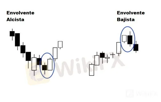Hay dos tipos de velas envolventes: Envolvente alcista y Envolvente bajista.