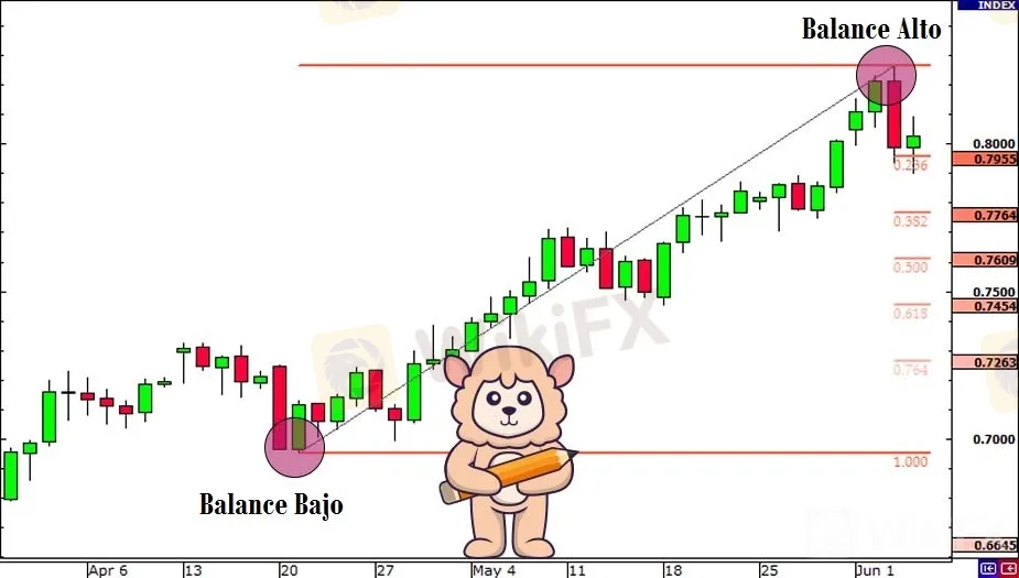 Aquí trazamos los niveles de retroceso de Fibonacci haciendo clic en el Swing Low en .6955 el 20 de abril y arrastrando el cursor al Swing High en .8264 el 3 de junio.