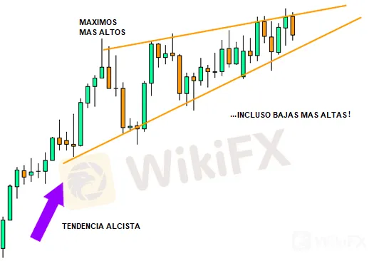 Se forma una cuña ascendente cuando el precio se consolida entre las líneas de soporte y resistencia con pendiente ascendente.