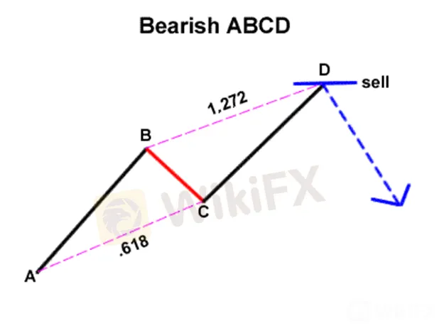 Si utiliza la herramienta de retroceso de Fibonacci en el tramo AB, el retroceso BC debería alcanzar el nivel de 0,618. A continuación, la línea CD debe ser la extensión de Fibonacci 1.272 de BC.