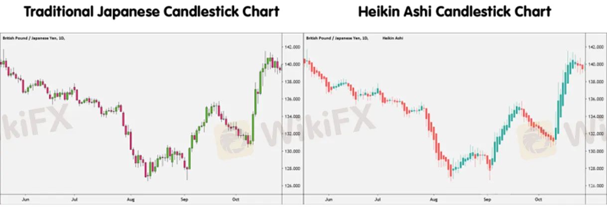 En comparación con el gráfico tradicional de velas japonesas, Heikin Ashi reduce la velocidad del mercado, eliminando señales falsas innecesarias.