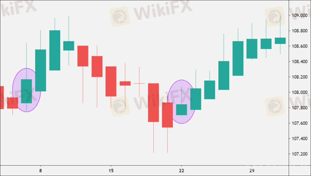 Las velas japonesas con cuerpos pequeños que mostraban sombras superiores e inferiores indicaban un posible cambio de tendencia (o una pausa en la tendencia).