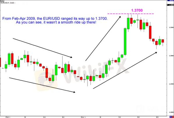Las actividades monetarias diarias de los EE. UU. pueden evitar que las formas monetarias basadas en el dólar estadounidense, como el EUR/USD (arriba), generen patrones de tendencia alcista fluidos.