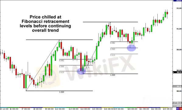 Los retrocesos de precios tienden a merodear alrededor de los niveles de retroceso de Fibonacci de 38,2 por ciento, 50,0 por ciento y 61,8 por ciento antes de continuar con la tendencia general.
