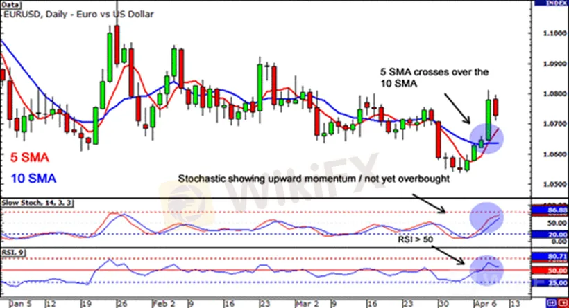 El estocástico nos ayuda a determinar si aún está bien que ingresemos a una operación después de un cruce de promedio móvil, y también nos ayuda a evitar áreas de sobreventa y sobrecompra.