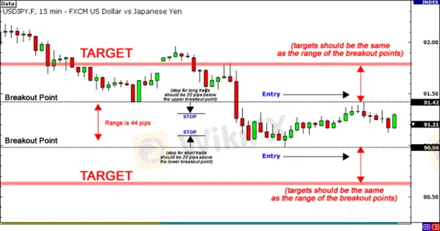 Este es el lugar donde debe hacer sus pedidos. Sus paradas deben estar 20 pips por debajo y por encima de los puntos de ruptura , y sus objetivos iniciales deben ser aproximadamente iguales al rango de los niveles de ruptura.