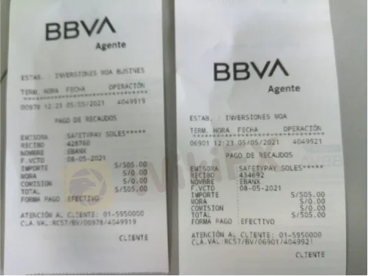 Depósito dos pagos, ambos por la suma de 505 soles, que serían en total 265$ dólares aproximadamente, a través de Safetpay, como se muestra en la factura de pago