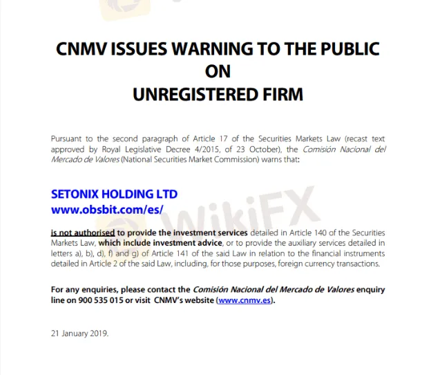 Además, la empresa proporciona números de contacto con los códigos telefónicos del Reino Unido, Alemania y España, cuando en realidad no está regulada en ninguno de ellos. Esto significa también que Obsbit se ha dirigido principalmente a residentes europeos. Además, el regulador español CNMV ha emitido una advertencia contra este broker: