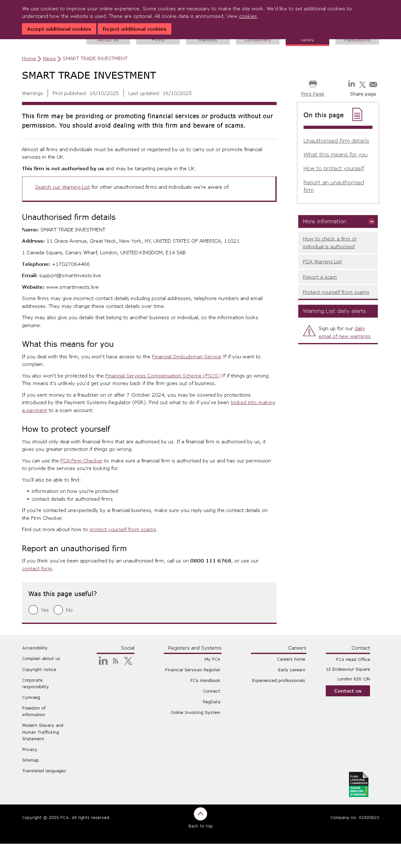 Lista de Advertencia de la FCA de empresas no autorizadas SMART TRADE INVESTMENT.