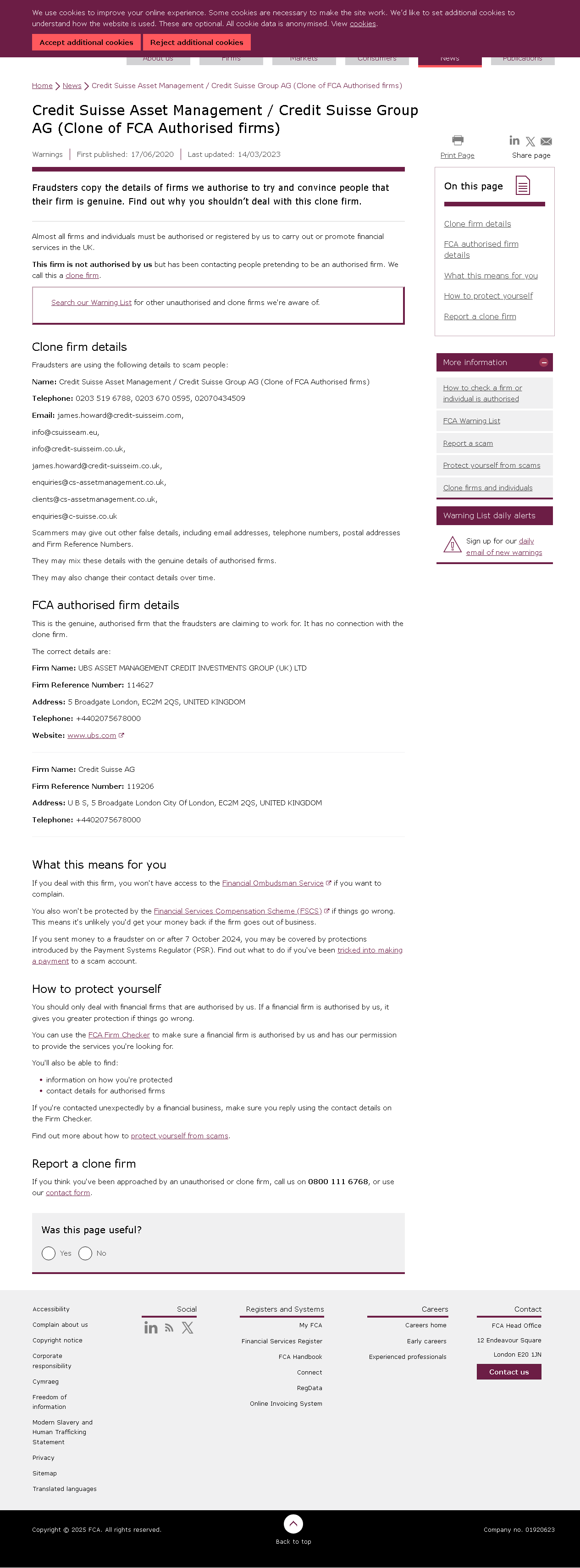Los estafadores copian los detalles de las empresas que autorizamos para intentar convencer a las personas de que su empresa es legítima. Descubra por qué no debería tratar con esta empresa clon. Casi todas las empresas y personas deben estar autorizadas o registradas por nosotros para realizar o promocionar servicios financieros en el Reino Unido. Esta empresa no está autorizada por nosotros, pero ha estado contactando a personas haciéndose pasar por una empresa autorizada. A esto lo llamamos una empresa clon. Busque en nuestra Lista de Advertencias otras empresas no autorizadas y clon que conocemos. Detalles de la empresa clon Los estafadores están utilizando los siguientes detalles para estafar a las personas: Nombre: Credit Suisse Asset Management / Credit Suisse Group AG (Clon de empresas autorizadas por la FCA) Teléfono: 0203 519 6788, 0203 670 0595, 02070434509 Correo electrónico: james.howard@credit-suisseim.com, info@csuisseam.eu, info@credit-suisseim.co.uk, james.howard@credit-suisseim.co.uk, enquiries@cs-assetmanagement.co.uk, clients@cs-assetmanagement.co.uk, consultas@c-suisse.co.uk Los estafadores pueden proporcionar otros detalles falsos, incluyendo direcciones de correo electrónico, números de teléfono, direcciones postales y Números de Referencia de Empresa. Pueden mezclar estos detalles con los datos genuinos de empresas autorizadas. También pueden cambiar sus datos de contacto con el tiempo. Detalles de la empresa autorizada por la FCA Esta es la empresa genuina y autorizada por la que los estafadores afirman trabajar. No tiene ninguna conexión con la empresa clonada. Los detalles correctos son: Nombre de la empresa: UBS ASSET MANAGEMENT CREDIT INVESTMENTS GROUP (UK) LTD Número de referencia de la empresa: 114627 Dirección: 5 Broadgate Londres, EC2M 2QS, REINO UNIDO Teléfono: +4402075678000 Sitio web: www.ubs.com Nombre de la empresa: Credit Suisse AG Número de referencia de la empresa: 119206 Dirección: U B S, 5 Broadgate Londres City Of London, EC2M 2QS, REINO UNIDO Teléfono: +4402075678000 "].