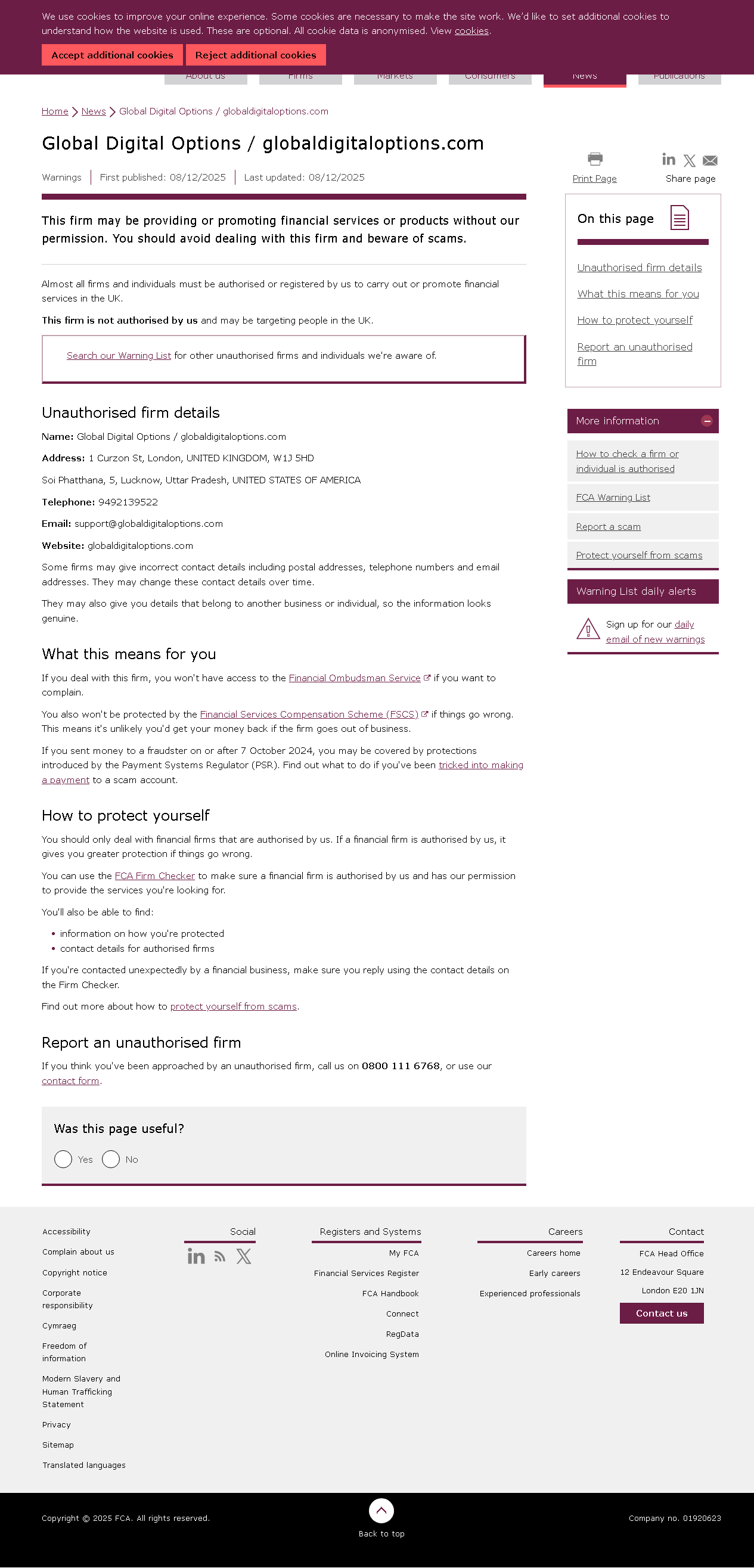 Lista de advertencia de la FCA de empresas no autorizadas Global Digital Options / globaldigitaloptions.com.