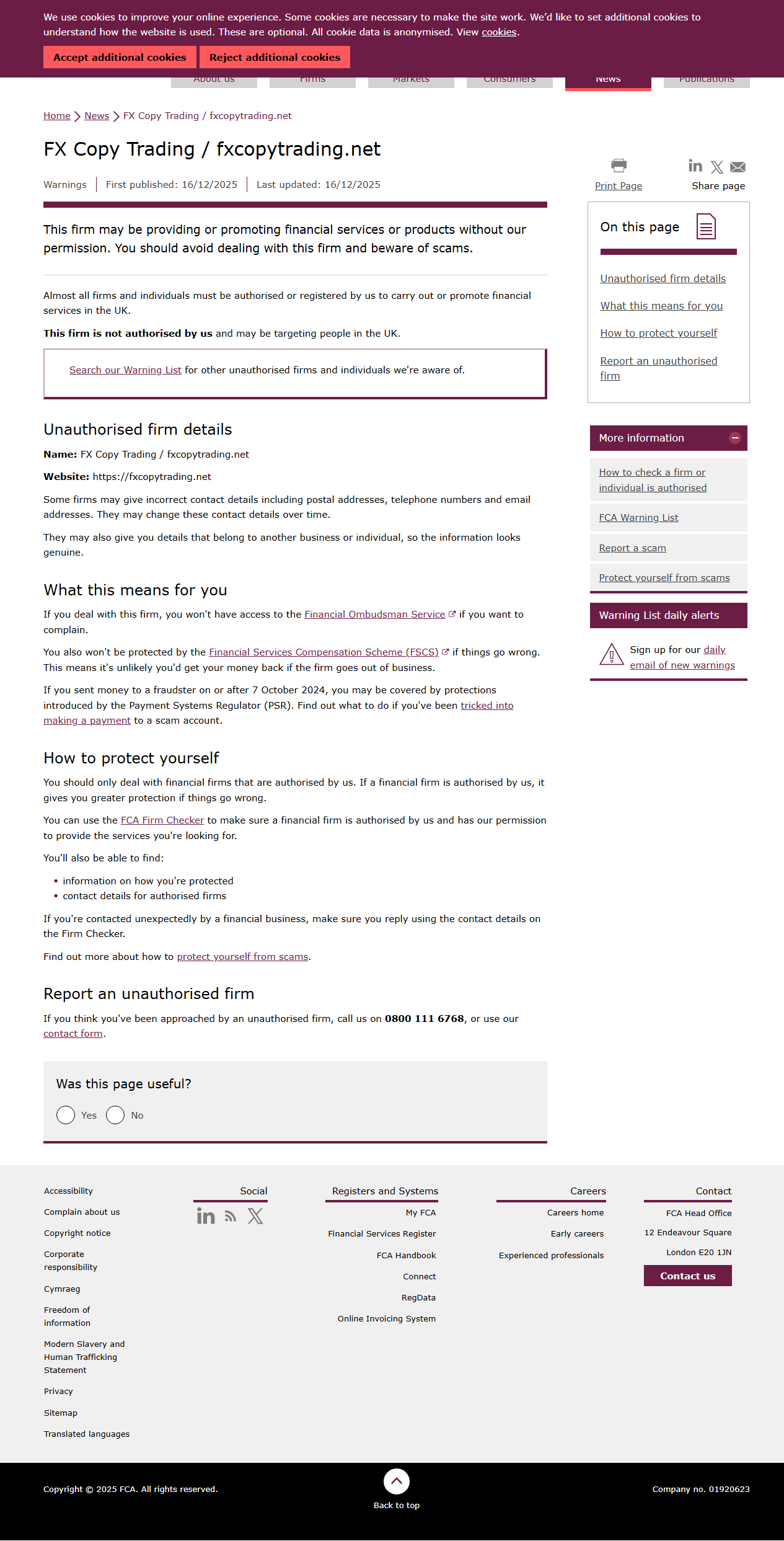 Lista de Advertencia de la FCA de empresas no autorizadas FX Copy Trading / fxcopytrading.net.