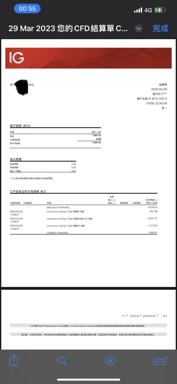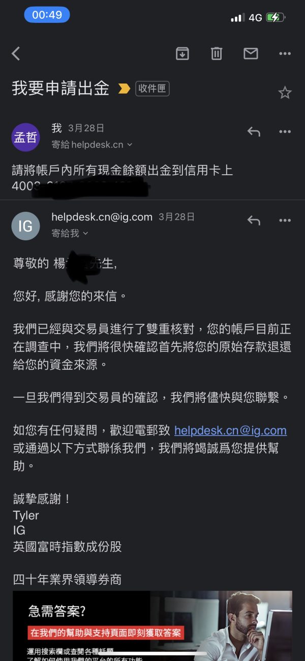 申请出金已經好幾天了,尚未出金,也不回覆 你們就直接凍結我的交易赈户,不能進行交易, 你們甚至還竄改我帳戶交易紀錄,把我的交易帳號從獲利變成是虧損。 請問這是正規券商會做的事嗎? 這就是全球知名的券商IG的行事作風嗎?