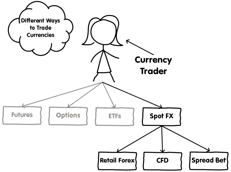 Sa labas ng U.S., ang retail forex trading ay karaniwang ginagawa gamit ang mga CFD o spread bet.