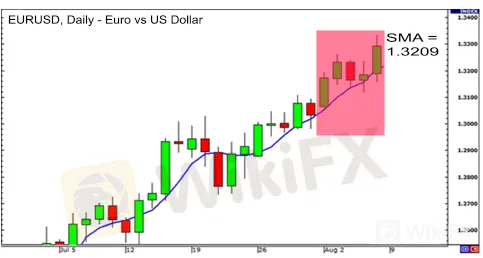 Sabihin nating nag-plot kami ng 5-period na SMA sa pang-araw-araw na chart ng EUR/USD.